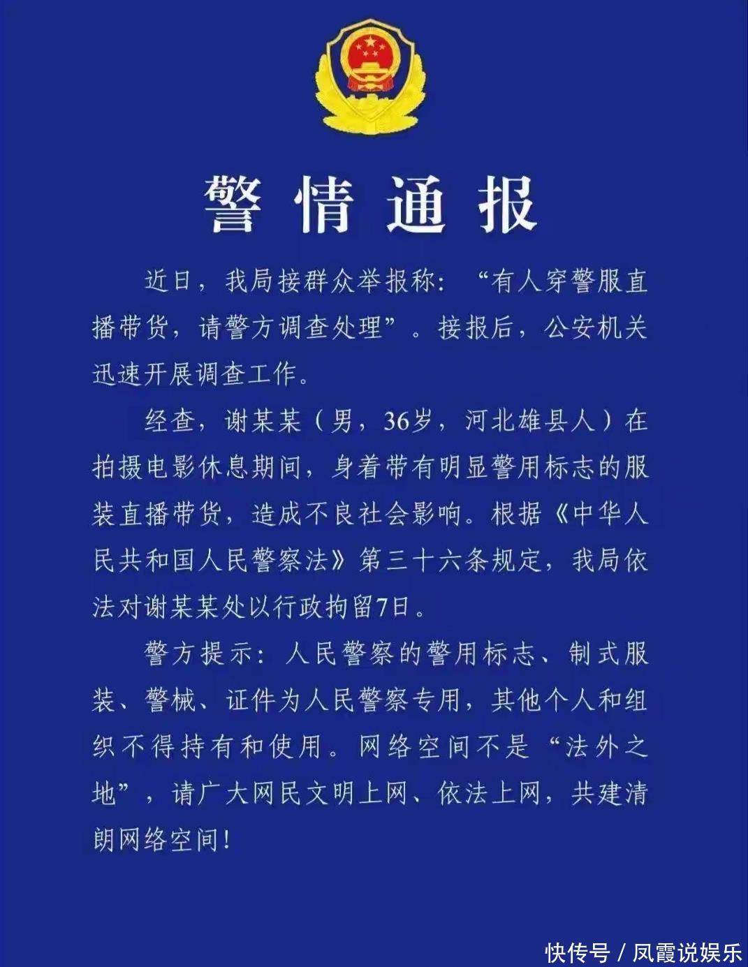 9月17日,云南警方通报,谢孟伟在拍摄电影休息期间,身着带有明显警用标志的服装直播带货,造成不良社会影响,对其行政拘留7日。随后,其快手账号被封禁,抖音号也被禁止关注。
